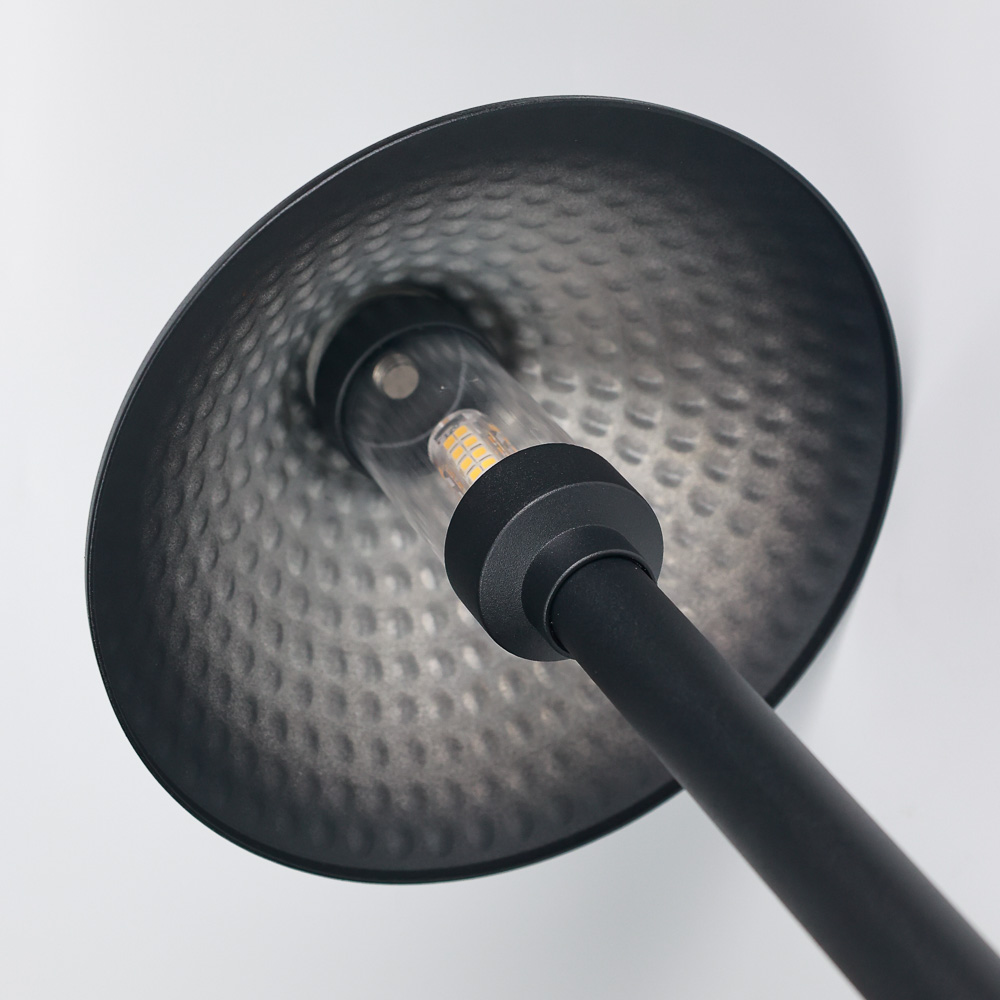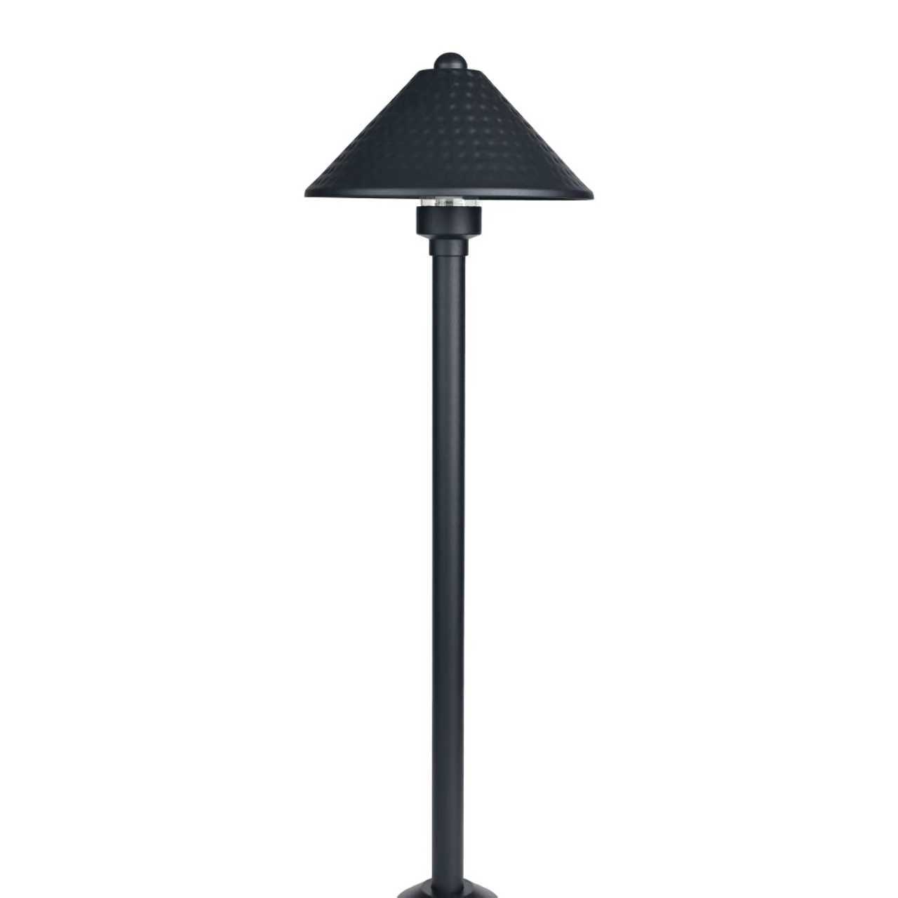 This Brass pathway lamp has a modern design. It features our widest hat and can project LED light to produce a generous region of illumination. It contains a G4 socket and uses a replaceable G4 Bi-Pin bulb. This lamp is black powdered finish.