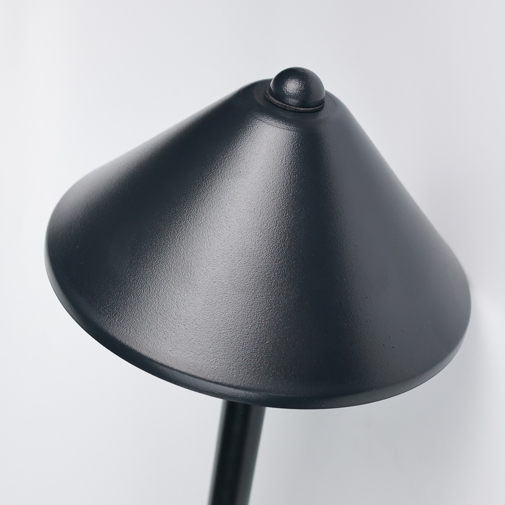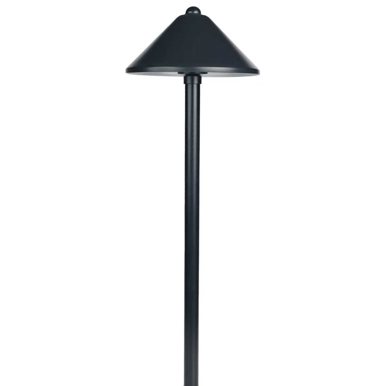 This Brass pathway lamp has a modern design. It features our widest hat and can project LED light to produce a generous region of illumination. It contains a G4 socket and uses a replaceable G4 Bi-Pin bulb. This lamp is black powdered finish.